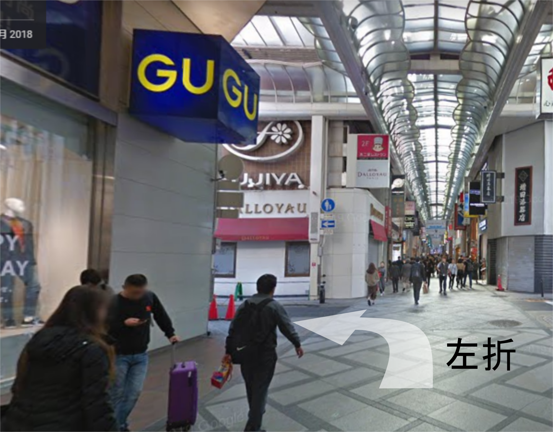 1つ目の信号機(ヨーロッパ通り 周防町筋)を超えて次の北西角が「GU」を左折(堺筋通りに向かう)です。